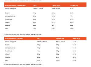 Aromă de caramel sărat: izolat proteic din zer, aromă, colorant (caramel amoniacal), clorură de sodiu, îndulcitor (sucraloză), emulgator (lecitină de floarea soarelui).